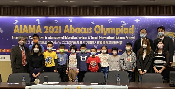AIAMA國際珠算聯盟於2021年12月12日在省商會會議室舉辦AIAMA珠心算奧林匹克國際大賽暨國際教育研討會,共有22個國家參加,圖為台灣部份得獎選手、大會會長楊程焰(左1)及教練合影留念。