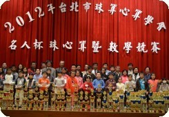 台北市珠算心算學會於年3月4日(星期日)上午,假台北市劍潭海外青年活動中心群英堂盛大舉辦2012年名人杯珠心算暨數學賽,今年的名人杯競賽由理事長楊程焰老師精心策劃、常務理事鍾健美老師和比賽委員會主任委員李皓晴老師負責賽前事務工作,加上眾多老師們的協助與配合,比賽圓滿成功!本屆比賽,在珠心算部份,和往年有些不同。為了讓更多孩子能一同體驗這場盛會,特別增設心算組,同時保留著名人杯最大的特色--唸心算比..