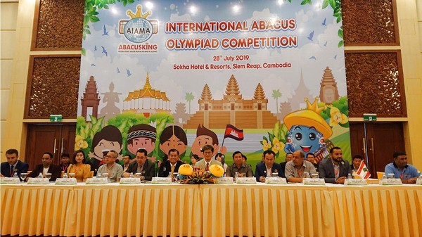 AIAMA (Abacusking International Abacus & Mental-Arithmetic Alliance)一年一度珠算國際奧林匹克世界大賽7月28日在柬埔寨暹粒市吳哥窟舉辦,台灣代表團由總顧問王良新及夫人黃慧娜、楊程焰團長、周啟超顧問、張志勇副團長、歐國欽總領隊、鄭慧綸領隊、鍾健美總教練、李皓晴老師等帶領選手及隨行團員共41名參與盛會。
