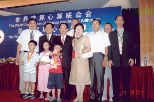 世界珠算心算聯合會於2004年8月13至15日在上海市中油大酒店盛大舉辦第1屆珠心算比賽以及第1屆理事會第2次會議。當天計有來自世界各地包括台灣、大陸、日本、韓國、美國、新加坡、馬來西亞、東加王國、泰國、汶萊、澳洲、加拿大、印尼、委內瑞拉、香港、澳門等世界各國或地區近千名同好及選手與會,可稱為全球珠算界的盛事。2004年8月雖然如以往在放暑假,但是對於珠算界來說可是熱鬧滾滾,繼台灣地區珠算界業於8..