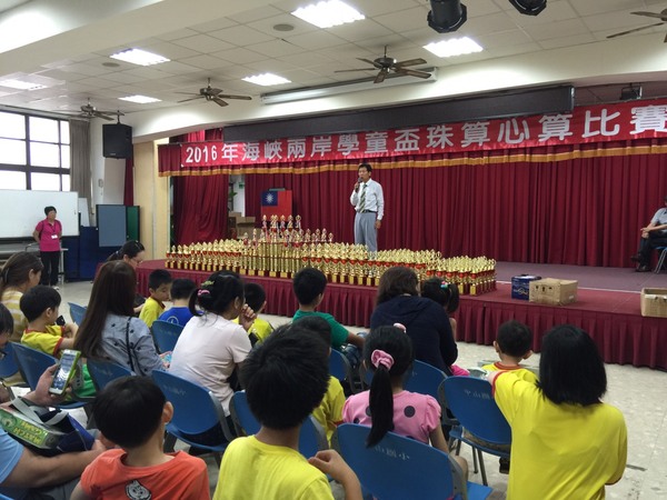 2016年海峽兩岸學童盃珠算心算比賽於5月22日在新北市板橋區中山國小禮堂舉行,共有數百名選手參加,當天除有激烈的比賽外,參賽選手也加入舞蹈、小提琴等才藝表演,現場氣氛熱鬧滾滾,圖為大會會長郭春生致詞一景。