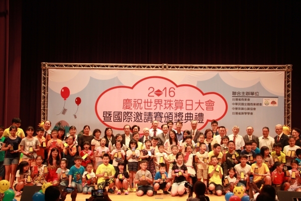 頒獎典禮完畢,全體與會人員、優勝選手及老師們大合影由台灣省商業總會與各單位聯合舉辦的「2016年慶祝世界珠算日大會暨國際珠心算數學比賽」,8 月 27日假新北市政府多功能集會堂舉行,今年大會活動,除了國內珠心算界人士踴躍參加,來自美國、日本、印尼、新加坡、香港等海外代表團以及大陸的兩岸組共達12支,其中日本2團隊是首次參加者,受到國內珠算界熱烈歡迎。此外,因逢我國的祖父母節,會中也舉辦祖孫樂活珠算..